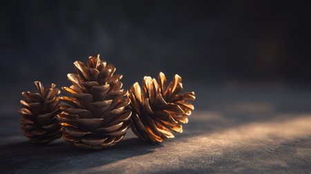Three intricately detailed pine cones rest on a textured surface, illuminated by gentle, warm light that enhances their natural hues, evoking a peaceful atmosphere in nature.