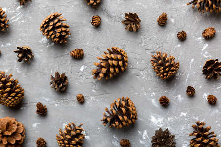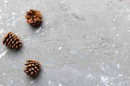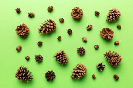 pine cones on colored table. natural holiday background with pinecones grouped together. Flat lay. Winter concept.
