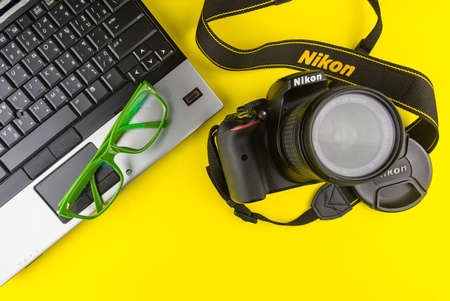 Bangkok, Thailand - March, 31, 2020 : Green frame glasses, Notebook computer and Dslr nikon d5300 isolated on yellow background.