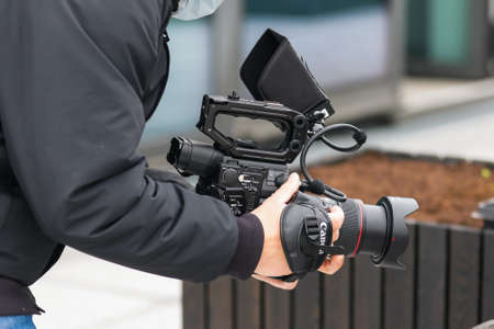 Man takes pictures on a Canon camera and tries to focus the lens and takes pictures. Photo editor, cameraman, journalist. Bishkek, Kyrgyzstan - December 15, 2019.