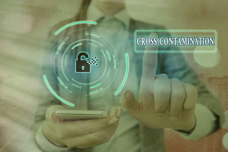 Conceptual hand writing showing Cross Contamination. Concept meaning Unintentional transmission of bacteria from one substance to another Graphics padlock for web data security application system