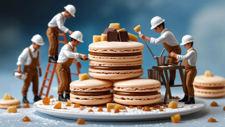 A creative and whimsical concept featuring tiny construction workers assembling and decorating chocolate-filled macarons. The scene is set as if they are working on a sweet construction site, adding sugar, chocolate, and caramel decorations. Perfect for food art, bakery themes, and imaginative storytelling.