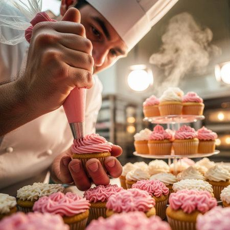 A pastry chef carefully decorating cupcakes in a gourmet kitchen, demonstrating expert skills