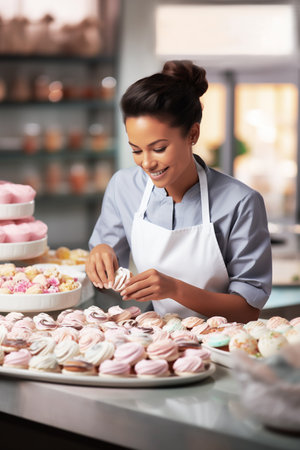 Pastry chef mixed race woman preparing and decorating cakes. Women cooking concept. Close-up. AI generative.