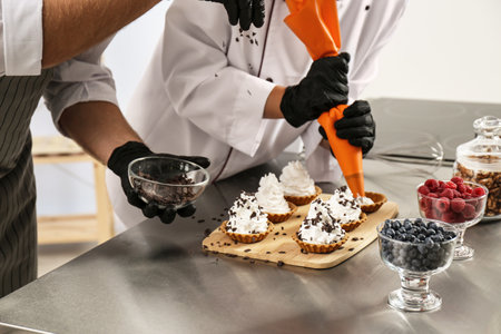 Pastry chefs preparing desserts at table in kitchen, closeup