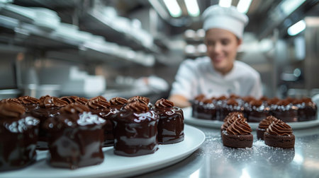 The chef is creating delicious chocolate desserts in the kitchen using various ingredients. The baked goods will be beautifully presented on tableware before being served as a delectable dessert