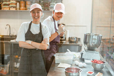 Positive women in aprons smile to camera standing in craft bakery shop