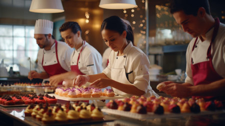 Workers in white aprons and chef hats, their hands expertly shaping dough and decorating cakes AI generated