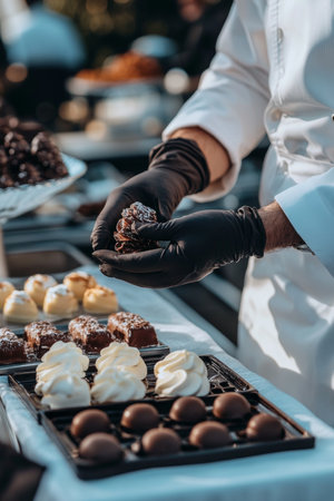 Close-Up, Chef s Hands in Black Gloves Arranging Gourmet Chocolates on a Dessert Tray