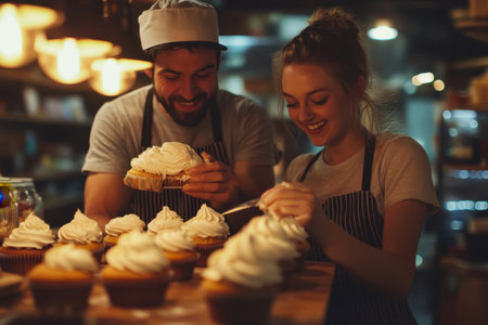 Two bakers joyfully decorate cupcakes with frosting in a warm, inviting cafe atmosphere during the evening.