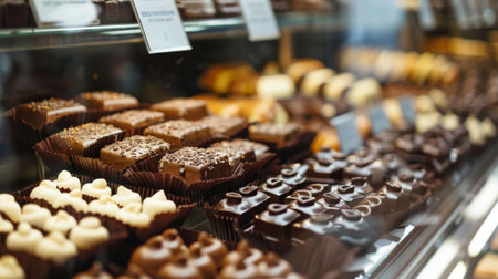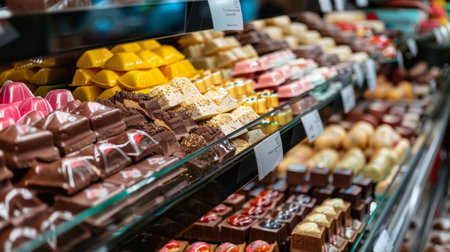 Assortment of chocolate colorful candies desserts on cafe showcase. Variety of sweets with different flavours nuts spices in store. Confectionery