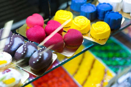 manu little colorful cakes beyond showcase in shop is on sale