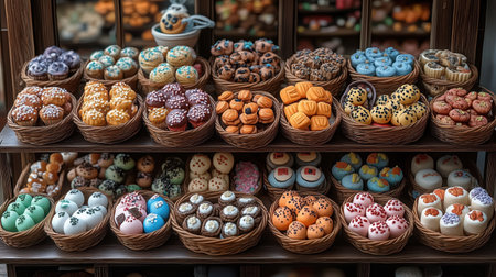 Close up view of an array of vibrant sweets, candies, and biscuits arranged in baskets and bowls, showcasing a playful and artistic presentation.