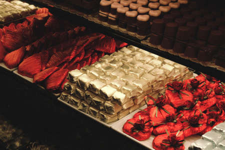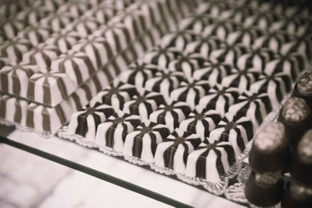 Assortment of dark milk chocolate candies desserts on cafe showcase. Variety of sweets with different flavours nuts in store. Confectionery
