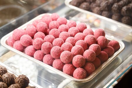 Chocolate balls with pink glaze. Sweets on showcase.