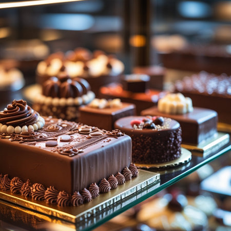 Chocolate cakes on a glass shelf in a confectionery shop