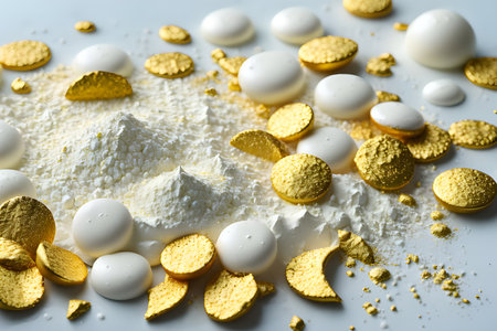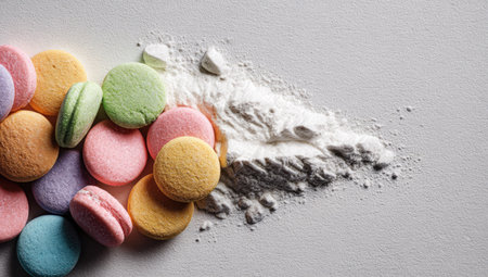 Pile of colorful macarons, various shades of pastel pink, blue, yellow, and green, are positioned on a light gray surface. A generous amount of white powder is scattered around and underneath the macarons. The image presents a visual contrast between the vibrant, sweet-looking macarons and the neutral, powdery substance.