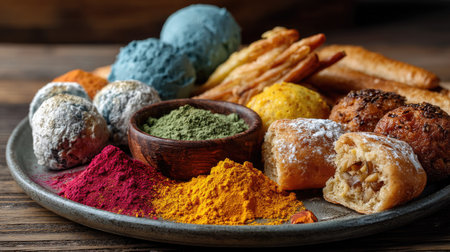 A beautifully arranged platter featuring an assortment of colorful sweets, ice cream, and vibrant spices, perfect for celebrating flavor and creativity.