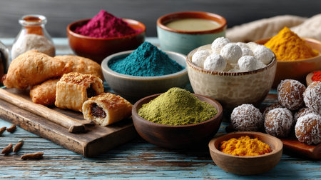 A vibrant collection of spices and delicious snacks displayed in rustic bowls on a wooden table, creating an enticing culinary scene for food enthusiasts.