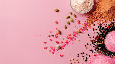 A vibrant arrangement of spices, powders, and colorful ingredients on a pink background, capturing various textures and tones for culinary creativity.