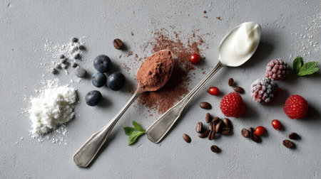 A visually appealing arrangement of fresh berries, cocoa powder, coffee beans, and yogurt presented on a gray surface, perfect for food photography and culinary inspiration.