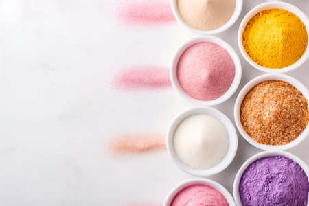 Small bowls filled with various colorful powders including pink, yellow, and white, arranged neatly on a clean surface, ideal for cooking or crafting projects.
