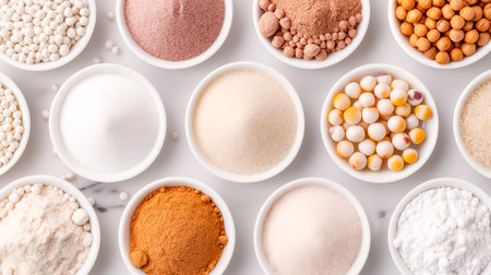 Top view of various powders and ingredients arranged on a marble surface, highlighting the textures and colors of different culinary elements.