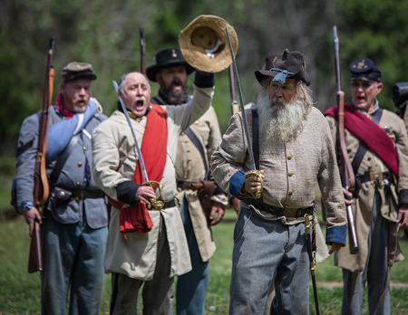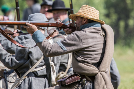 HUNTERSVILLE, NC - JUNE 6 2015: Reenactors in Confederate and Union army uniforms recreate a surrender ceremony during an American Civil War battle reenactment at Historic Latta Plantation.