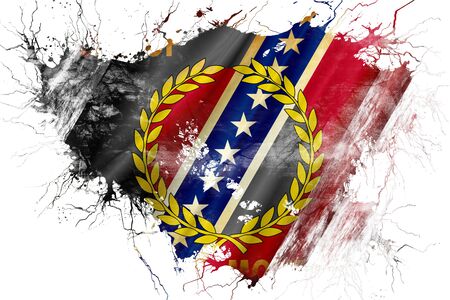 The national flag of the US state Mississippi in against a gray smoke on the day of independence in different colors of blue red and yellow. Political and religious disputes, customs and delivery.