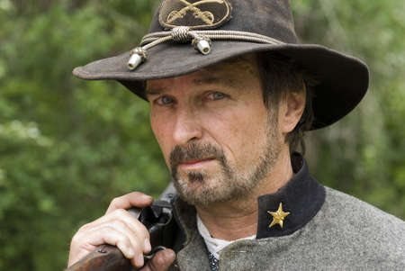 Confederate Civil War reenactor holding the Confederate flag.