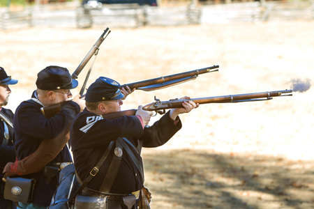 Kennesaw, GA, USA - November 20, 2016: A small group of Civil War reenactors wearing union uniforms fire their muskets in a firing demonstration put on at Kennesaw Mountain National Battlefield Park, on November 20, 2016 in Kennesaw, GA.