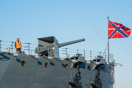 Saint-Petersburg, Russia - June 16, 2024: fragmant of protected cruiser Aurora, currently preserved as a museum ship