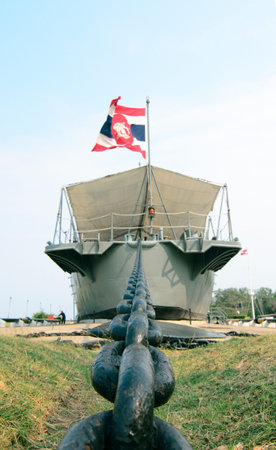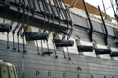 A medieval cannon cannon is aimed at a modern ship. Natural daylight