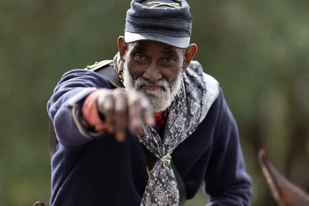 New Orleans, Louisiana, USA - February 23, 2019: Mardi Gras Parade, African American man wearing civil war uniform riding a horse, pointing at the camera