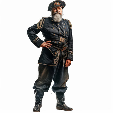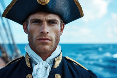 Malaga, Spain - October 26, 2014: Portrait of a captain of the 1800s Royal Navy. Reenactor wearing a british uniform, blue frock coat and bicorn hat. People behind with the royal marines uniform.