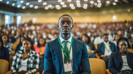 Portrait of african american public speaker giving talk at business event. Generative AI.