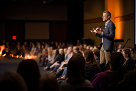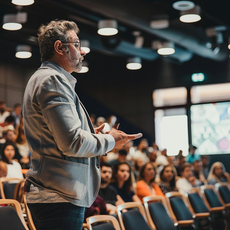 Dynamic Speaker Captivates Audience with Powerful Presentation at Business Conference.