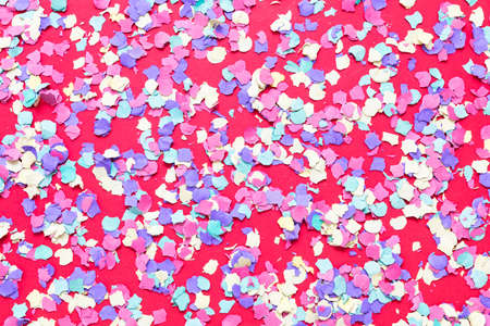 Confetti festive background. Colorful bright paper circles on pink. Decoration for carnival and birthday celebration party.