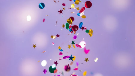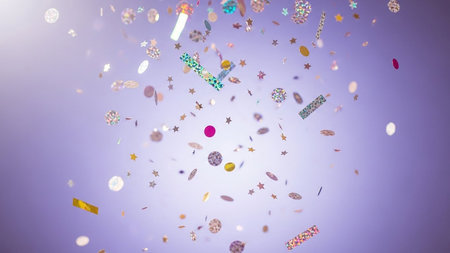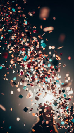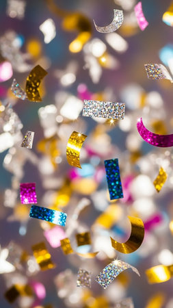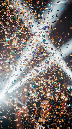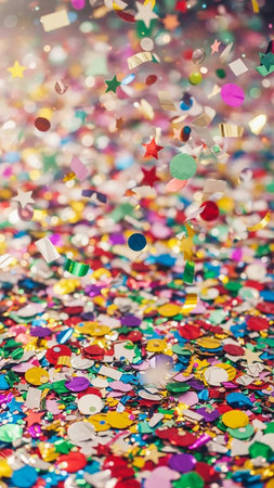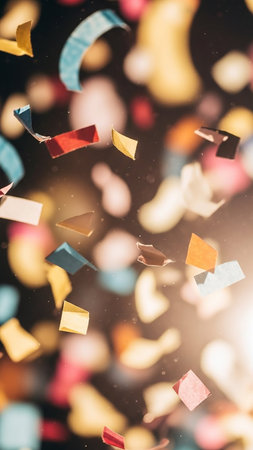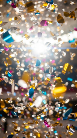 A vibrant cascade of colorful confetti and shimmering glitter falls and swirls in mid-air, illuminated by a bright, luminous light source creating a dynamic,...