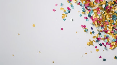 A vibrant arrangement of colorful confetti scattered on a bright background. Ideal for celebration themes, party planning, and festive events.