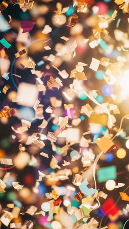 Golden and colorful confetti pieces float in the air, illuminated by soft bokeh lights, creating a magical and celebratory atmosphere for an event.