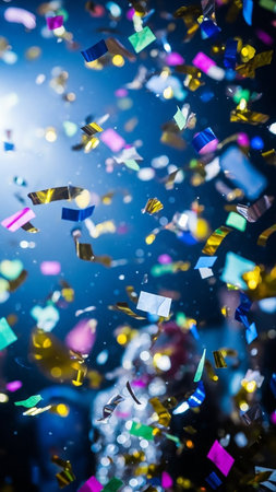 Colorful confetti and streamers fall and swirl dynamically against a dark blue background, illuminated by blurred lights and bokeh effects.