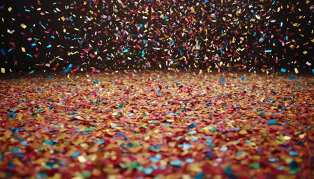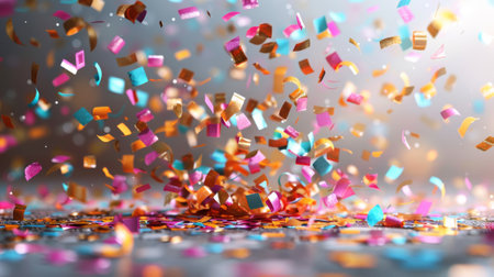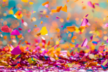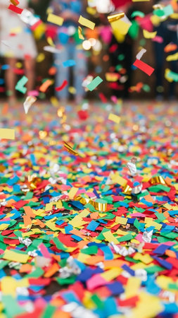 Bright and colorful confetti rains down on the ground, creating a vibrant atmosphere filled with joy and excitement during a festive celebration or party.