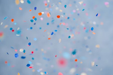 Colorful confetti flying in the blue sky. Abstract Festive and Holiday Background