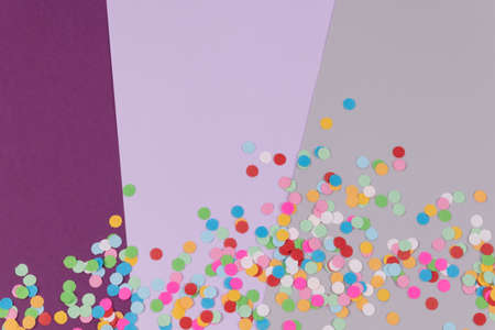 Multicolored confetti scattered randomly on an abstact background of gray, violet and lilac lines