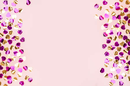 Pink and golden heart confetti on pink pastel trendy background. Festive background for projects.