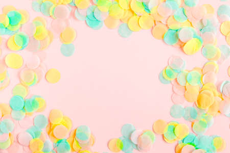 Colorful paper confetti on pink background. Celebration concept. Flat lay. Top view.