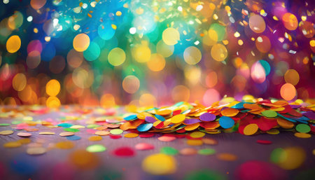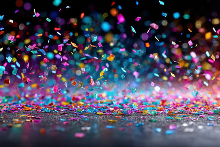 Bright bursts of vibrant confetti dance and shimmer, creating a lively and joyful atmosphere perfect for celebrations and special events.