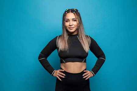 Beautiful sportswoman wearing sportswear smiling on blue background