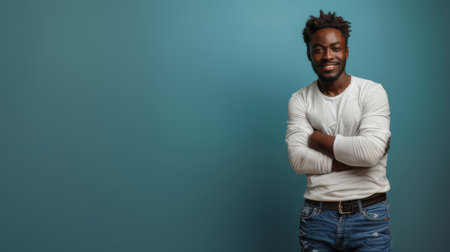 Portrait of a smiling young man wearing casual clothing, posing confidently with arms crossed against a blue background.